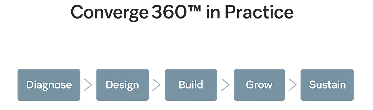 Converge360™ embeds leadership and team development into the systems design and architecture, ensuring capability growth and cultural alignment evolve alongside process maturity.